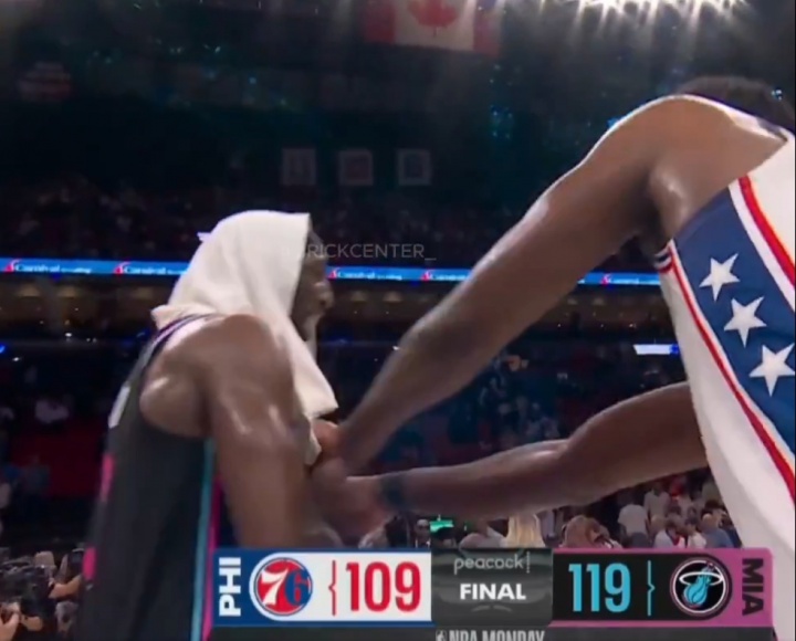 末节最后时刻,恩比德不慎掐到阿德巴约喉咙。裁判吹罚为普通犯规。
